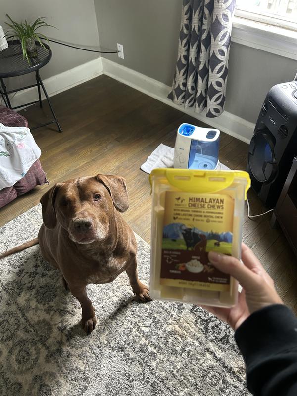 I gave these Himalayan Cheese Chews a try for my older pup, and he is obsessed! As soon as I open the container, he sits and stares at me like in the picture—completely