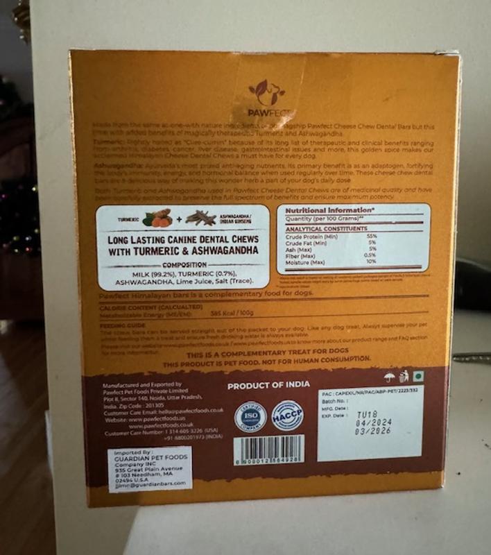 This chew has great ingredients. Tumeric and ashwagandha are what caught my eye. This chew is hard and hearty. The pack come with 3. It is great for big dogs with great teeth. My 7 years old golden doodle had a blast. I took it away after 1 hour, rinsed and then gave it to him again the next day. It took him 3 days to finish chewing. It kept him focus and entertained. I highly recommend for big dogs as a healthy chew.