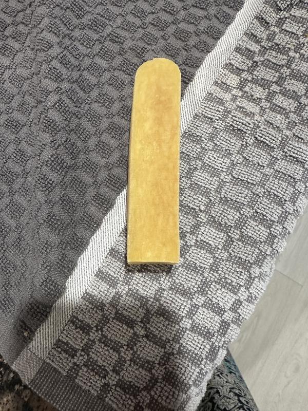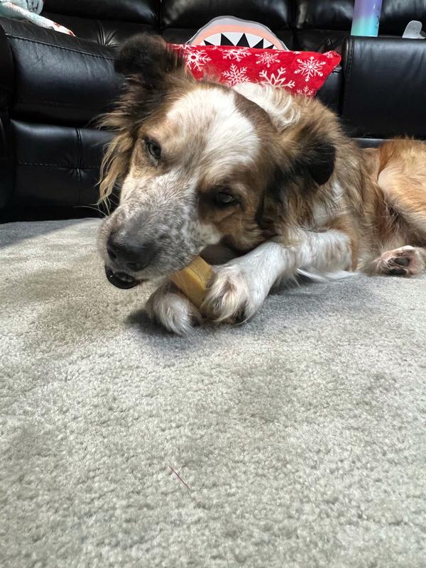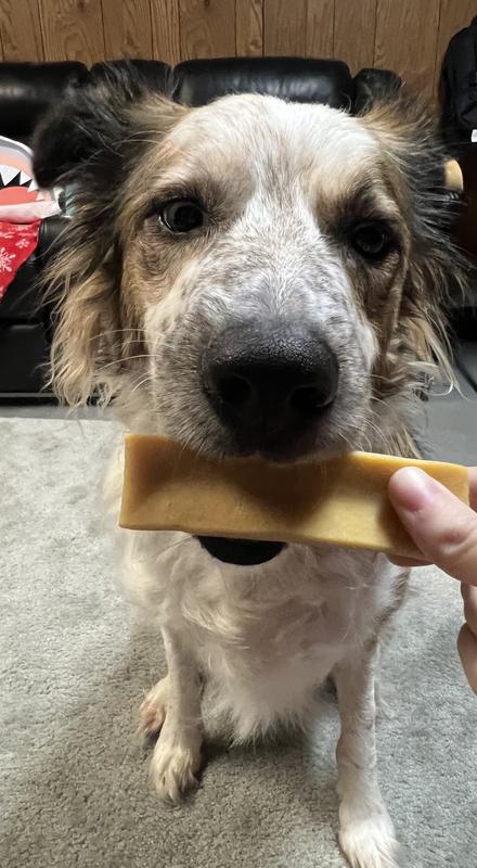 My dog was very happy with this chew! He started chewing on it after very little inspection on his end, which is a good sign from him. It took him over 10 minutes to get through 1/3 of it and he can be a rough chewer. It did cause his mouth to bleed a little bit but he didn’t seem to be concerned by it. I like that it keeps him busy for a while. I also like how they don’t have a strong smell like most dog chews. Overall, this product is a great, long lasting, tasty treat that my dog highly approves of!