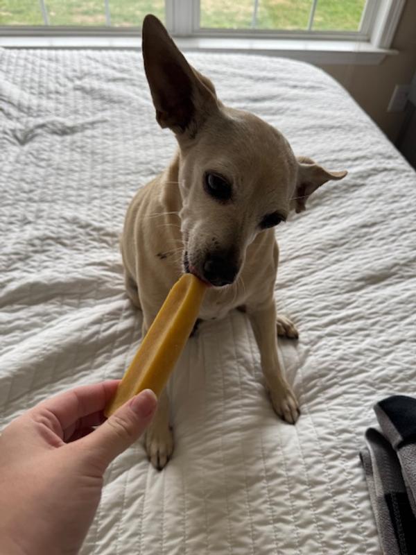 My dog unfortunately did not care for this treat but I still want to give it 5 stars as it seems like a great product I just have a very picky small dog. I want him so badly to eat this for his teeth health so I will keep trying haha. I did microwave it for a while to puff it up and that made him a little more interested but not enough to actually go at it. If your dog likes these chews this would be a good one to invest in. :)
