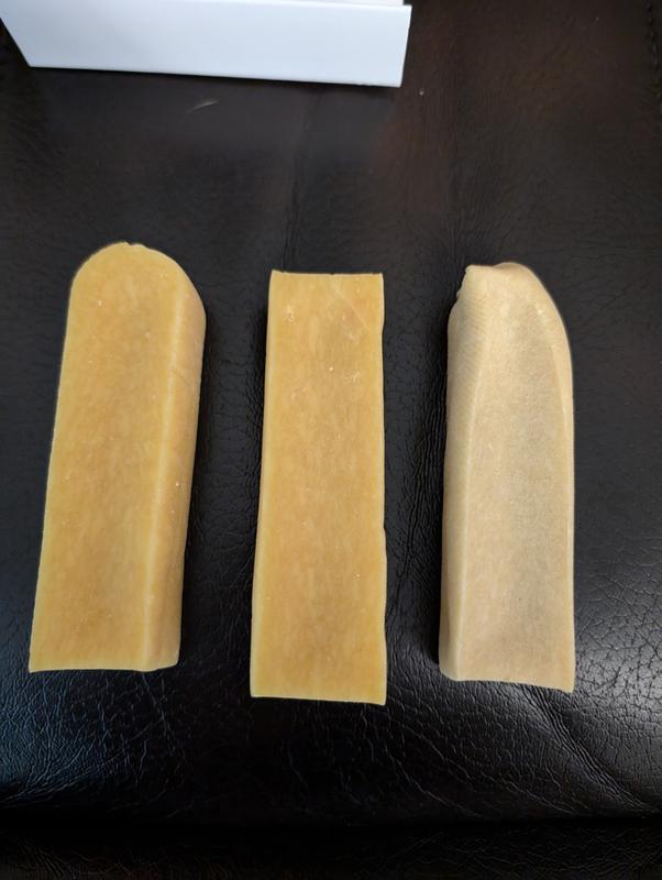 My chihuahua/pomeranian was super excited as I was opening the package for these chews! He immediately started gnawing on it, licking it and scraping it with his teeth. He was only able to get small pieces/slivers off as he chewed. I wouldn’t trust these with my bigger, heavier chewer dogs. He chewed on it for about 10 minutes and then got distracted with other toys. Not sure yet about longevity of the chew but I think these are a great chew option for the smaller pups. My small dog gives it two paws up!