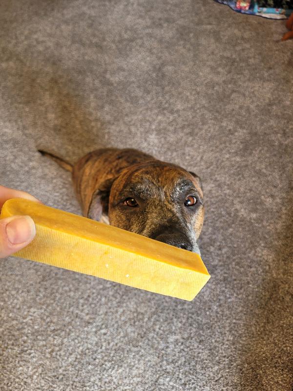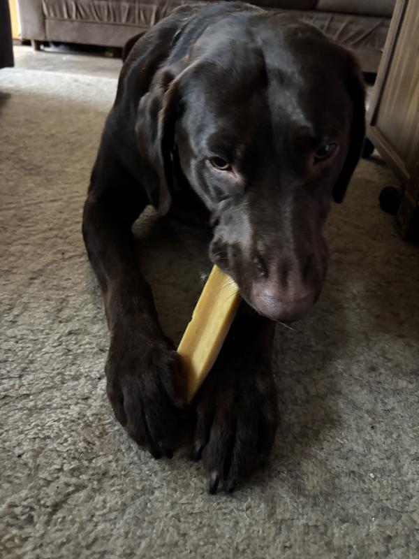 My dog finishes even supposedly long lasting treats in minutes. This he chewed so long he got bored and went back to it later and it's still around after a few days. He definitely enjoyed it. Previously I've used other brands of yak chews and small sharp slivers came off when he chewed. Not big enough to choke on but really uncomfortable when they're in your sheets because your dog likes his treats in bed. So far no sharp slivers from this yak chew. I'm impressed, will definitely buy more.