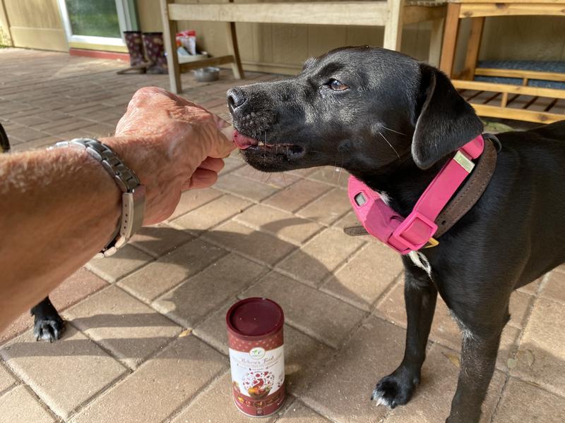 I really like that these treats aren't messy. You can put a couple in your pocket or pouch with no oily residue. Maybe a couple of crumbs. The small can they come in is cute and easy to get in and out of. I love that. No zip top…that’s whatI’m talking about! According to Stretch and Jolene, these are High Value Treats. We will order these again for sure.