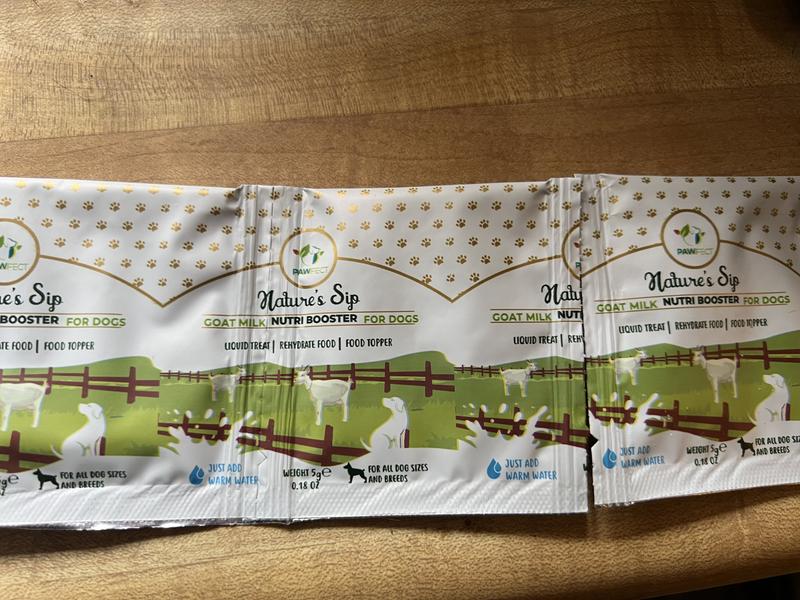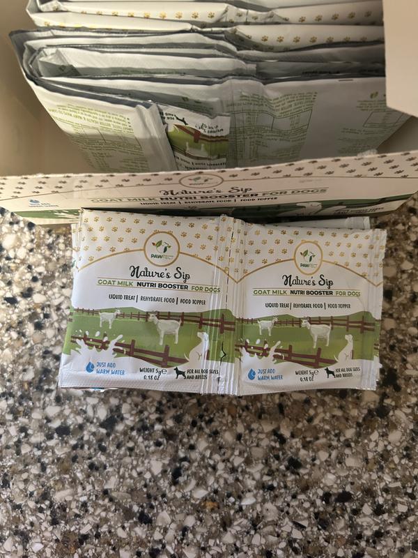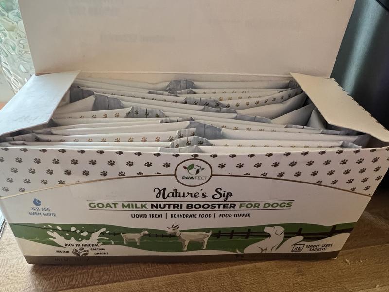 One of my dogs is a picky grazer and the other can barely eat anything that isn’t dry kibble without getting an upset stomach. I’ve been using the Natures Sip Goat Milk Nutri Booster on their food and not only has my picky eater been eating but the other has not had an upset stomach yet. The dogs now look forward to their Natures sip at meal time. And it’s super easy to use. Just add warm water, mix, and serve on their kibble.
