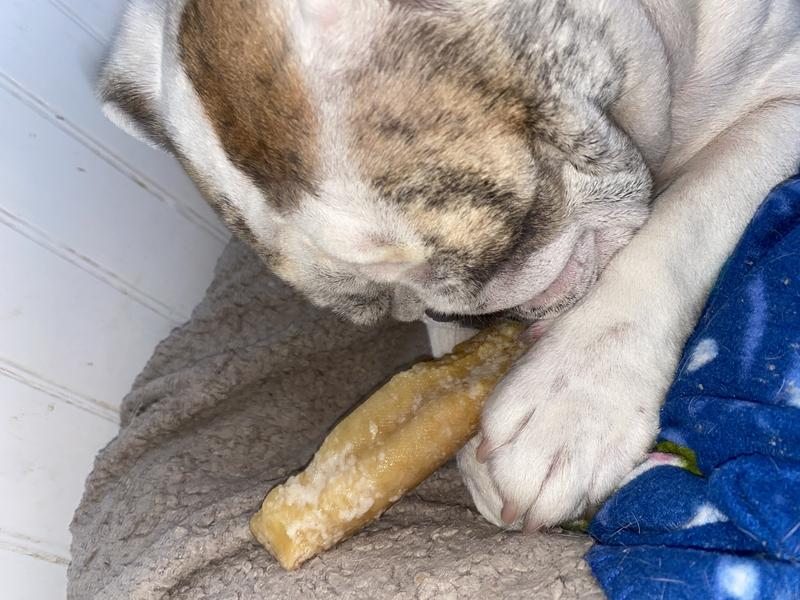 My dog didn’t show much interest in this yak chew initially. She chewed for a minute then it laid there most of the day before she returned and chewed for a few