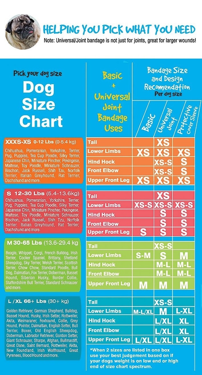 Sizing is determined by dog weight. This cover is made to be placed over PawFlex disposable bandages. Please refer to the size chart attached below: