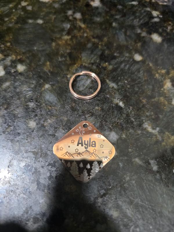 This tag feels like great quality! It has a nice sold weight to it and the engraving is clean and easy to read. The rose gold color is gorgeous, but highly reflective and prone to smudging. This doesnt bother me in the slightest, but might be something to consider. I chose the Darknight design and it was centered perfectly with even more stars than pictured! It is a larger size, but my dog will grow to about 30lbs and I think the size is perfect. It's easy to see that my dog has an I.D. tag on from far away. Overall, very satisfied!