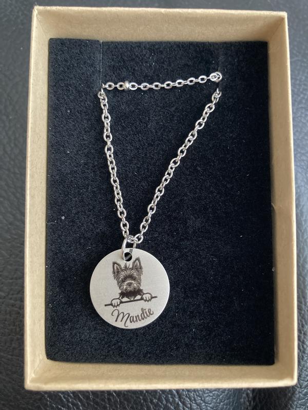 I love wearing this necklace. The image looks JUST like my Taz and it feels a little like he's still with me. I did not realize when I ordered it that it was a double-chained necklace. I am not a fan of these and may not have even ordered it had I known. Then I had the realization that this is my necklace and if I don't like it, I can change it! I used my jewelry pliers and removed both the second chain and the extension clasp. I love this necklace now! It's my Babe (he answered to that), with me wherever I go now that he's not at home waiting for me anymore. I still miss him, but this helps.