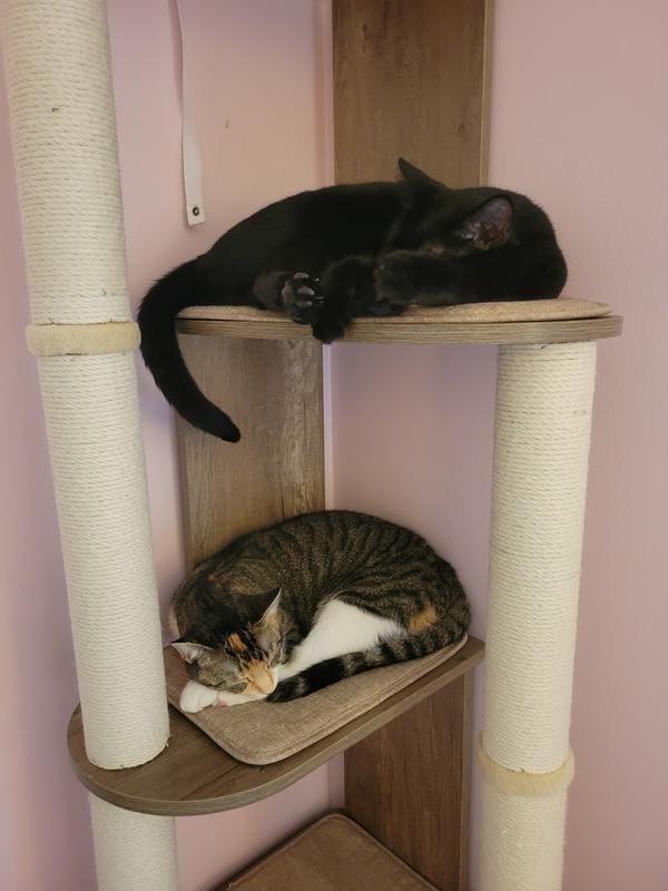 Fits nicely in a corner, looks much nicer than an all carpet/rope model, and is easier to clean. But, there are fewer options for the cats to get up on it since 2 sides are blocked off, and there are so many smooth panels. I like the smaller footprint, but because of that there just isn’t a lot of clearance between the alternating shelves. This makes it tricky for larger or less brave cats to climb down a shelf at a time. Getting up is easier, plus there are the sisal poles. So, my bigger boy is not very interested in using it, because he’s afraid of the getting down part. But, his smaller brother has adapted. I can tell the little cushions that go on each shelf won’t last. They are launching pads for the cats to move to the next shelf, so the claws really dig in. I could see claw marks in them after a 2 days. Finally, it’s lighter and so less stable than other trees I’ve used. That’s not a problem because it comes with the hardware to secure it to the wall. But, I wouldn’t recommend using it without using that fastening if you are going to have more than one cat playing on it at a time.