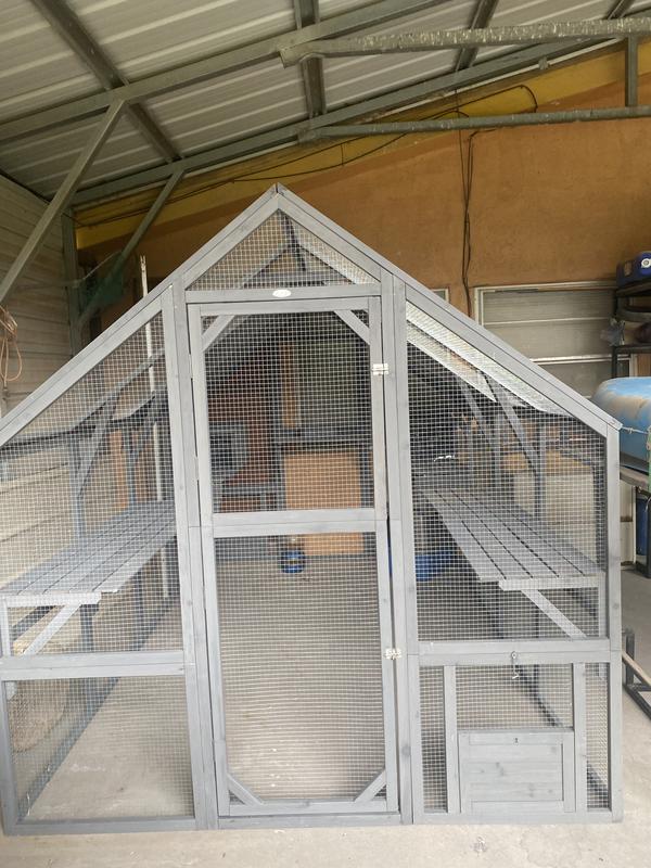 What are the mesh specifications? How does the mesh attach to the wooden frame? Is there a panel on the end opposite the entrance door that can be opened for access?