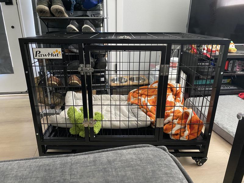 PawHut Heavy Duty Double Door Lockable Wheels Dog Crate, Black, 36-in