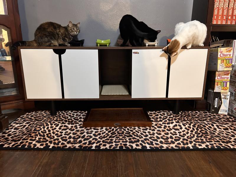 There is 1 cat door hole on each side of the interior, single size: W24.5*H40cm; you would choose the appropriate litter box according to that size.