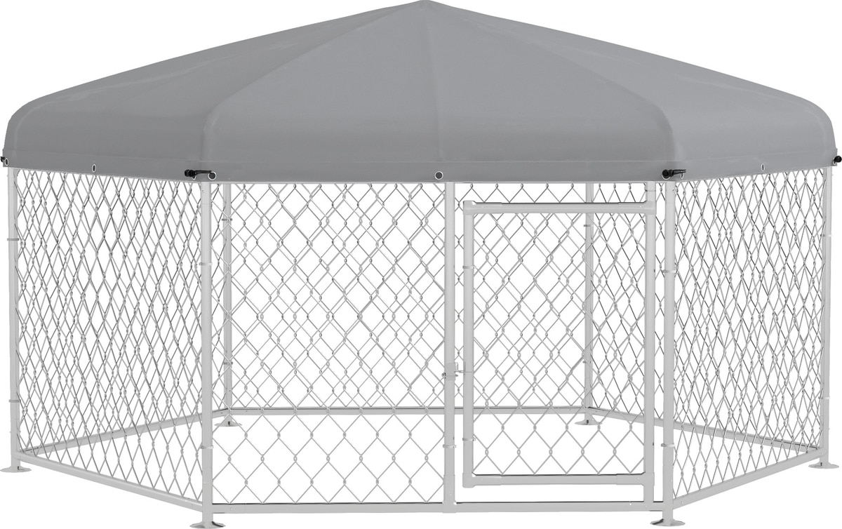 - This outdoor enclosure is designed in a hexagonal shape to accommodate larger breeds up to 66 lbs.