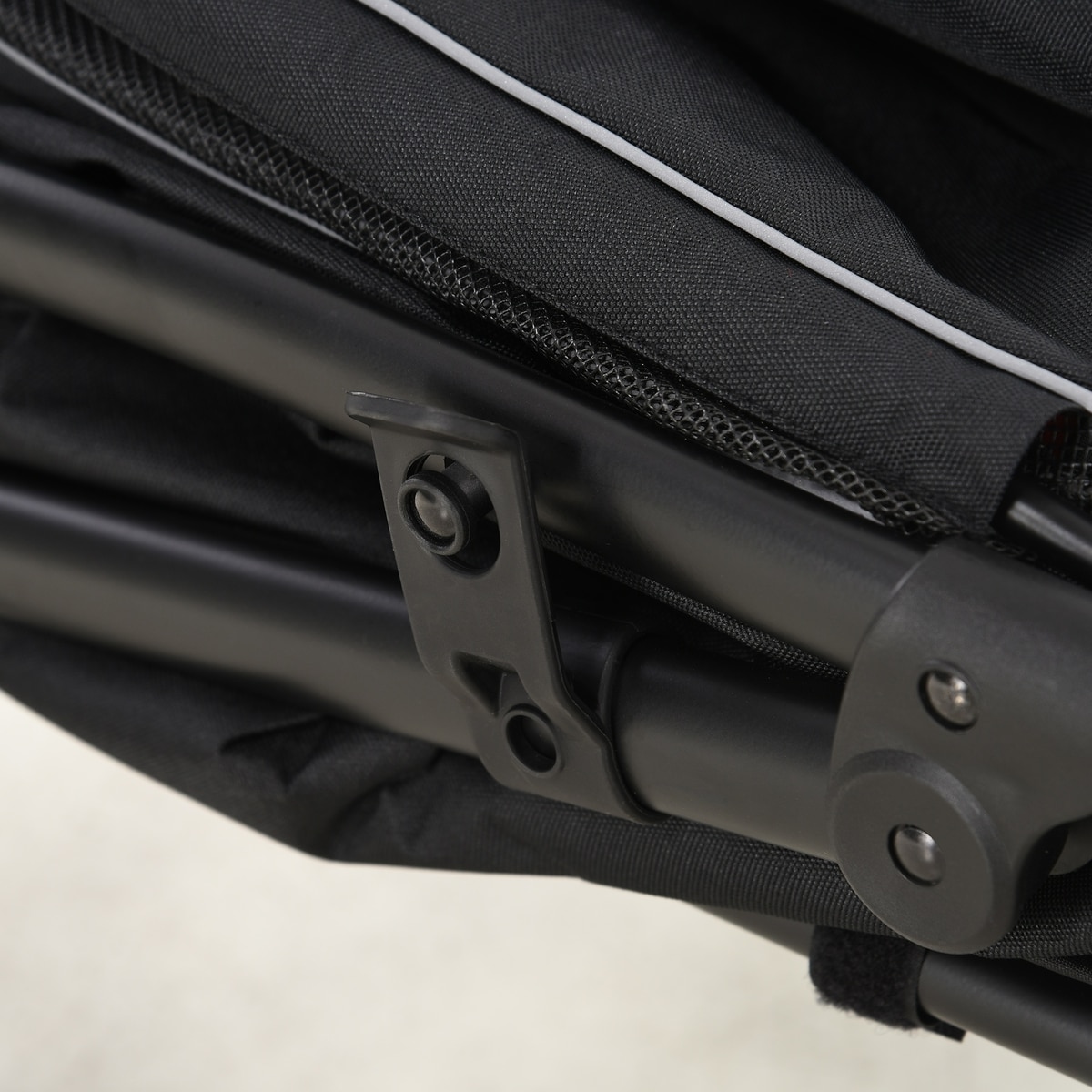 - This pet stroller is equipped with shock absorbers and well-ventilated mesh doors and windows for a smooth and comfortable ride for your four-legged friend.