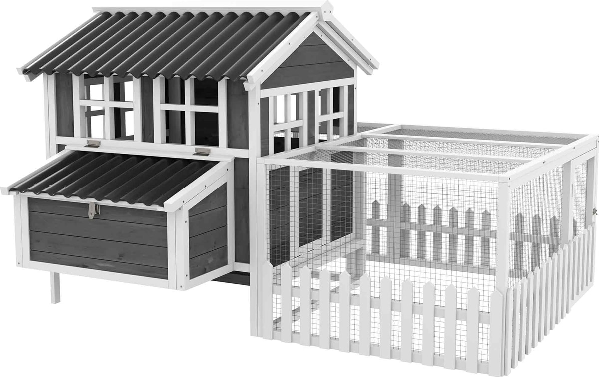 Equips your hens with two roosting bars, a nesting box, and charming fencing for both function and flair.