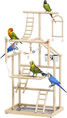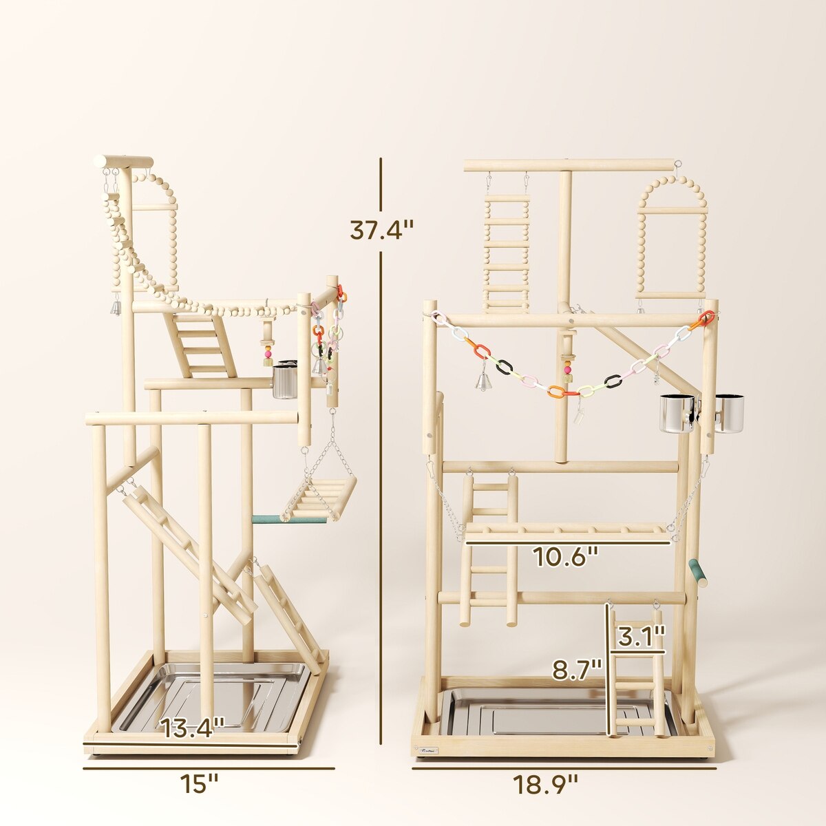 PawHut Playground 4 Layer Wooden Parrot Play Stand with Ladders, Chain Toy, Stainless Steel Cups & Tray, Natural Wood, 18.9 x 15 x 37.4-in