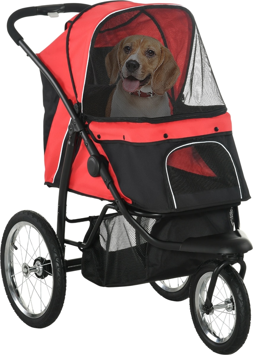 This is a great dog stroller. It’s roomy enough for our 17 pound rat terrier to stretch out in and the big wheels will go over any terrain without a problem. There are multiple areas for storage if that is something you would use. It folds up easily. Well worth the cost for our dog who is deaf and blind. She loves her daily walks!