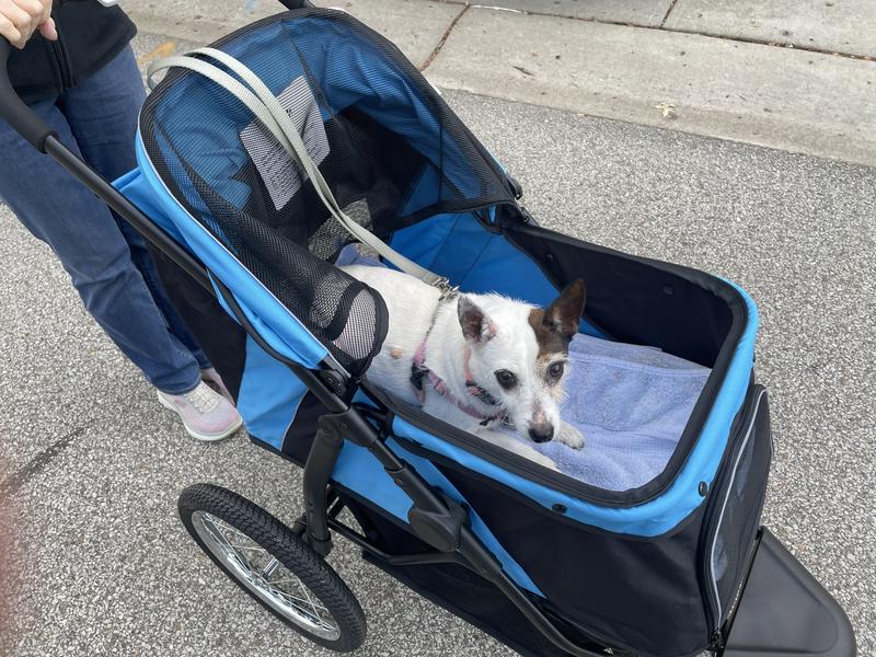 Love this stroller for our senior dog with a cardiac condition. We are able to do some hybrid trail walks on his favorite trails and we can get our steps in too