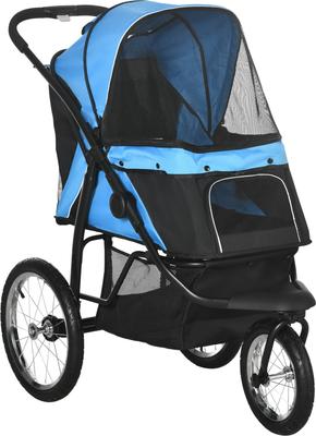 This is a great dog stroller. It’s roomy enough for our 17 pound rat terrier to stretch out in and the big wheels will go over any terrain without a problem. There are multiple areas for storage if that is something you would use. It folds up easily. Well worth the cost for our dog who is deaf and blind. She loves her daily walks!