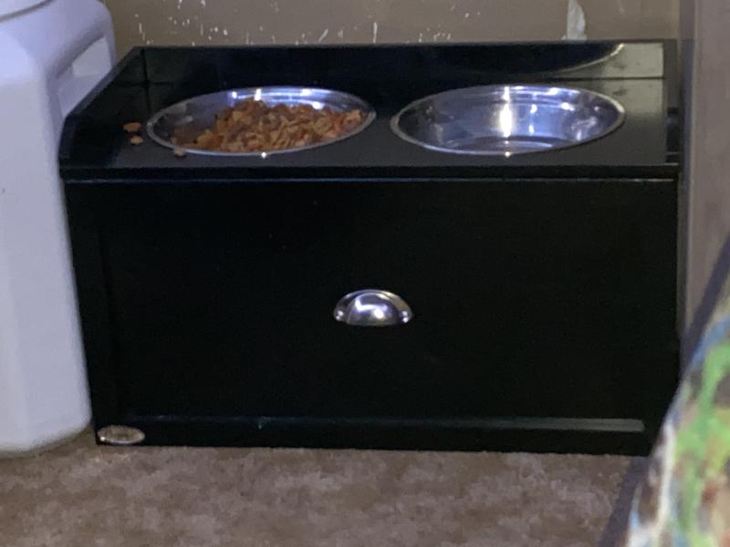 I got this elevated food stand for my two dogs and their food bowls. I needed something to try and contain the food mess our one dog makes while eating. Having the