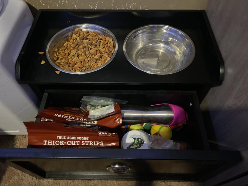 I love the heights and the ease of access to bowls. I don’t like that it drips water in the drawer if they are messy. I put a dish towel in the bottom to catch the water which works but the stuff in there will get wet so ziplocks are good to protect treats.