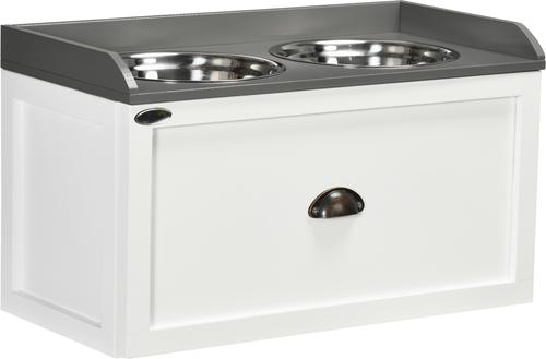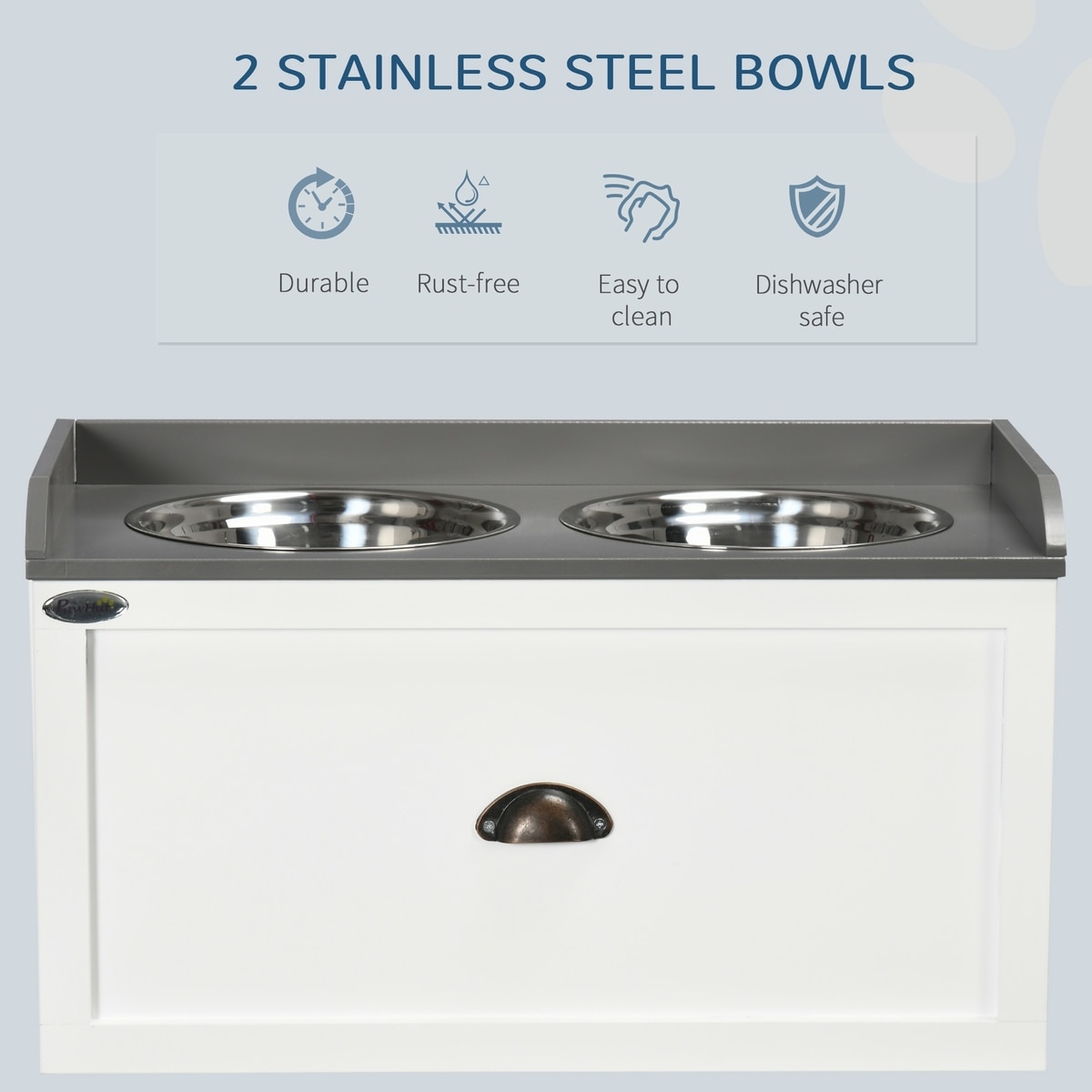 PawHut Stainless Steel Elevated Dog Bowls with Storage Drawer, White