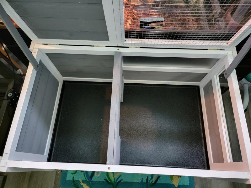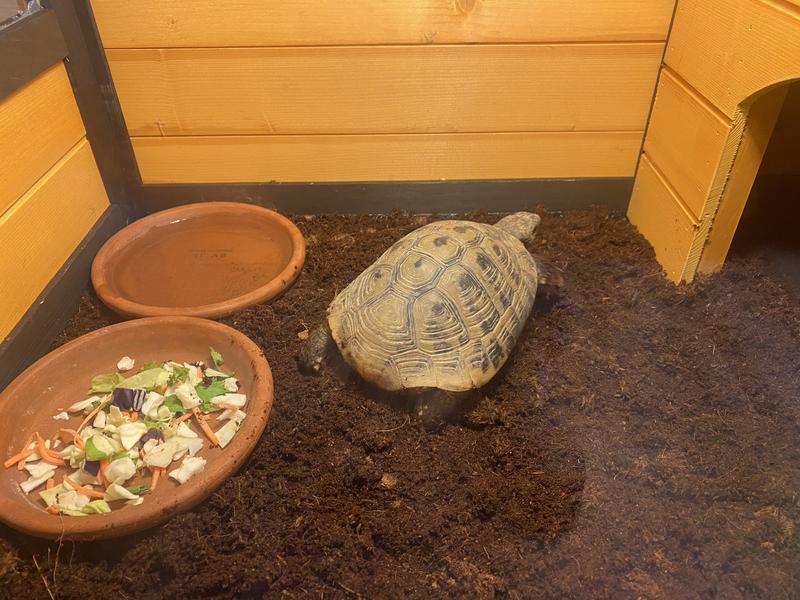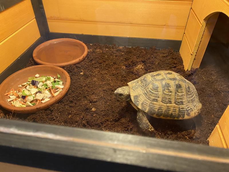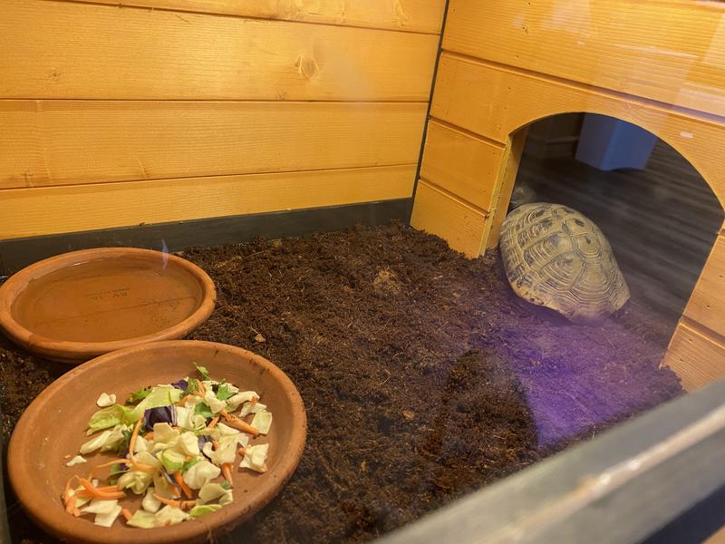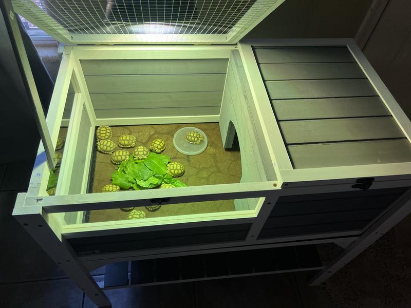 Overall I’m very happy with this hut. It gives my tortoise a safe, comfortable space and has extra storage underneath for supplies. Assembly was fairly straightforward and the wood feels sturdy once everything is put together. The size is good for my Russian tortoise. I also like that it has a divider area, so you can separate the habitat into a “warm side” and “cool side” . One thing, is that the wood isn’t sealed, so if you plan to use water dishes or want higher humidity, I’d probably add a waterproof liner. Overall, it’s a great starter habitat that looks much nicer than a plain tank or plastic bin, and it blends in well with home furniture.