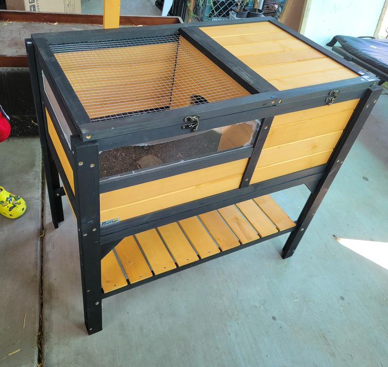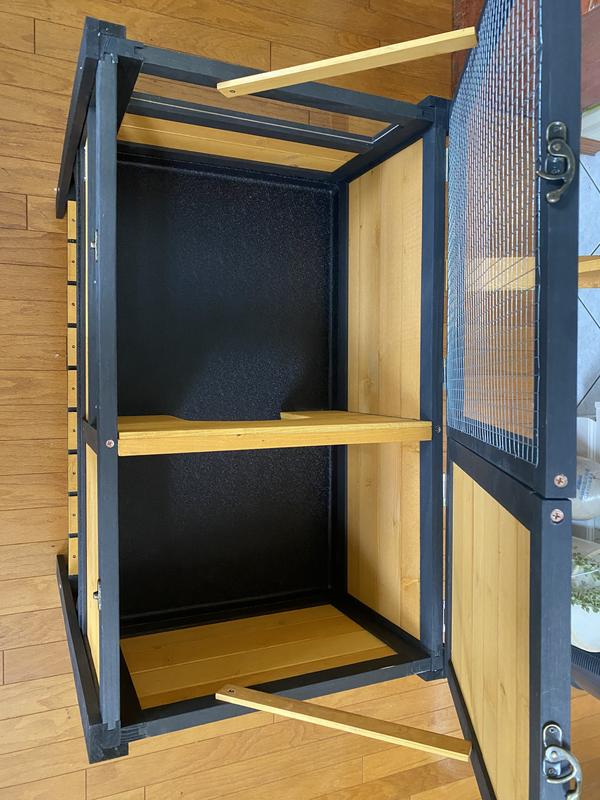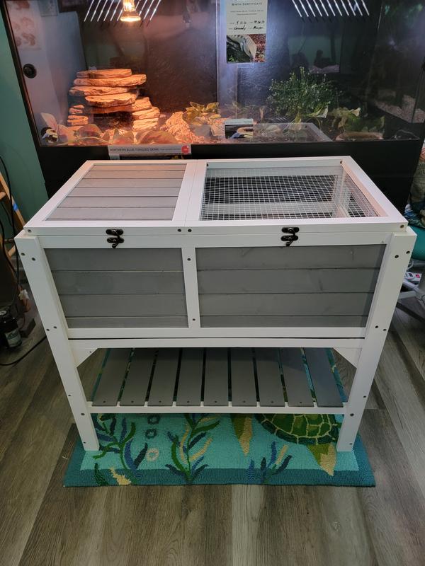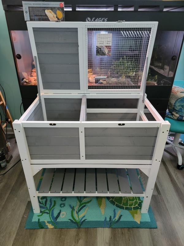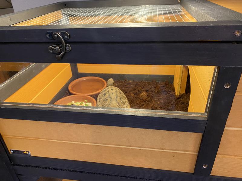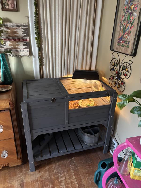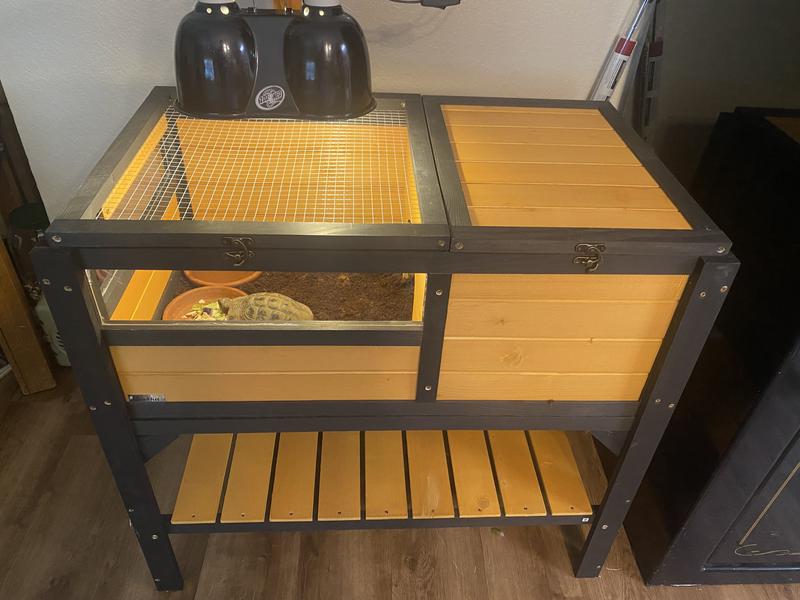 This great for my baby tortoise! She has somewhere to go and sleep, plenty of room for her to roam, for now anyway. Only issue is that the bottom tray is permanent. A little difficult to clean, but not impossible. Overall, I’m really happy with it. The extra shelf is really nice to store things and the height is nice to be able to see in and not bend over.