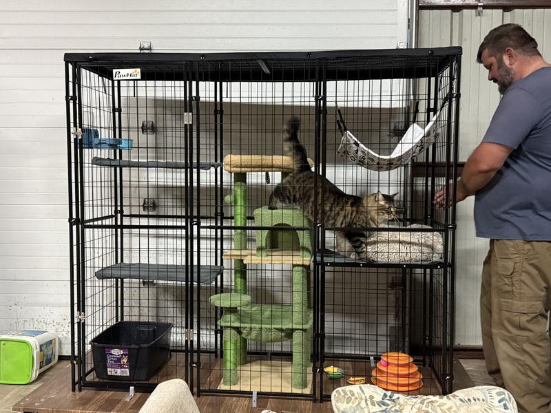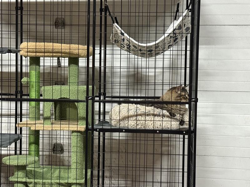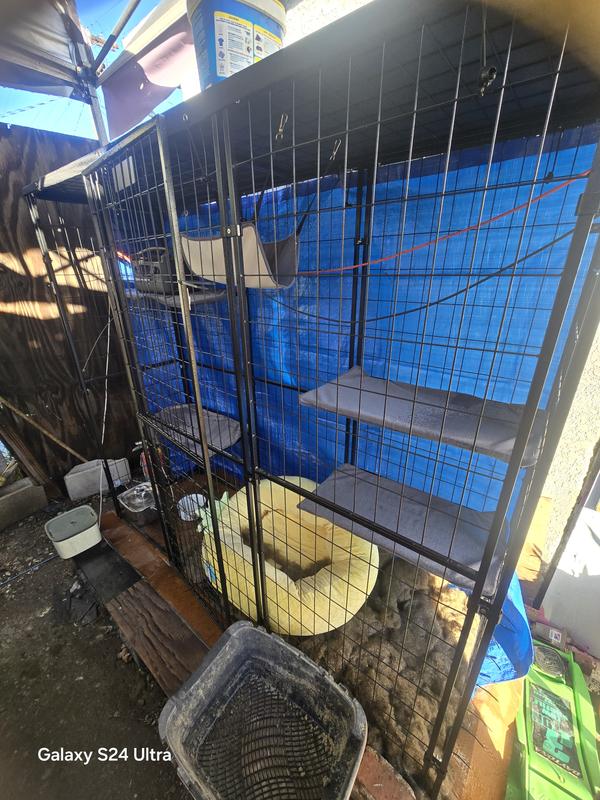 This catio is designed for outdoor use and includes a waterproof and UV-resistant polyester cover. The cover helps protect your cats from sun exposure and light rain, making it suitable for use in most weather conditions. For best longevity, we recommend placing it in a sheltered area and removing or covering it during extreme weather such as heavy storms, snow, or high winds. This model is generally sturdier and lower-maintenance than traditional wooden catios. It features a strong steel frame with welded wire mesh, which does not warp, rot, or crack like wood can over time. The steel construction provides excellent stability, even when cats climb on the walls or platforms, and is well-suited for daily use. Overall, this catio offers a durable, secure, and weather-conscious option for safely allowing your cats to enjoy the outdoors.