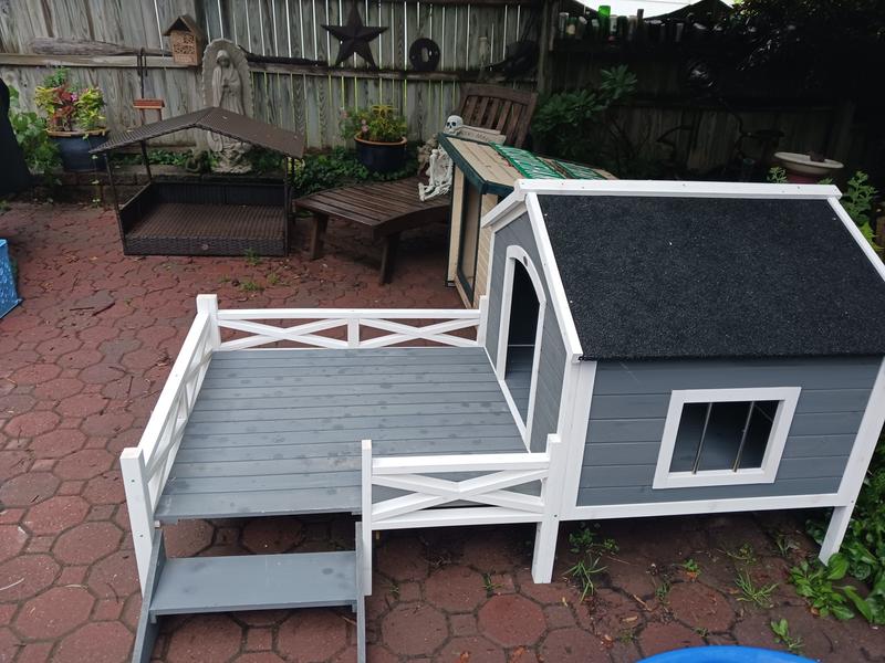 Absolutely cute! Well made pine dog house. Only took 45 minutes to assemble. My 60lb pit bull loves to sun bathe on the attached deck area. Would recommend