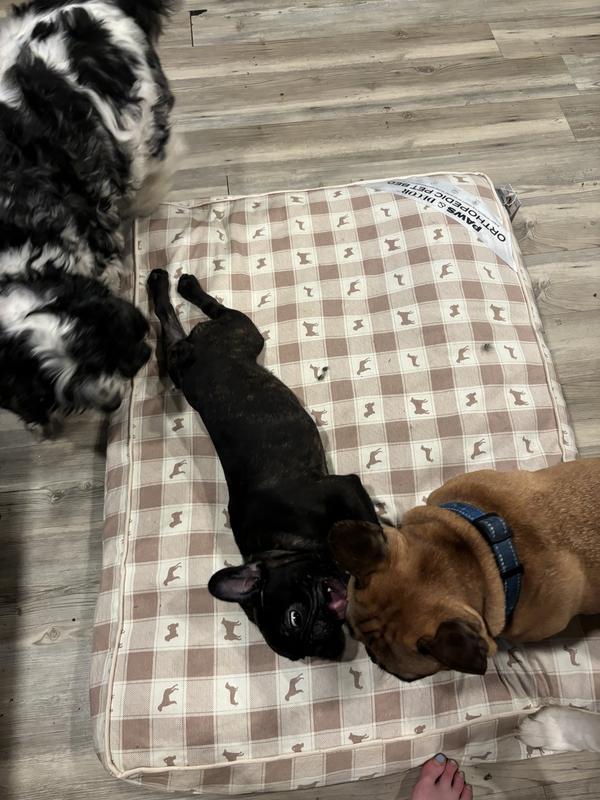 This bed is a hit! Comfortable for both small and large dogs. Easy to remove the cover for washing. Not too heavy so it is easy to pick up and move into other rooms