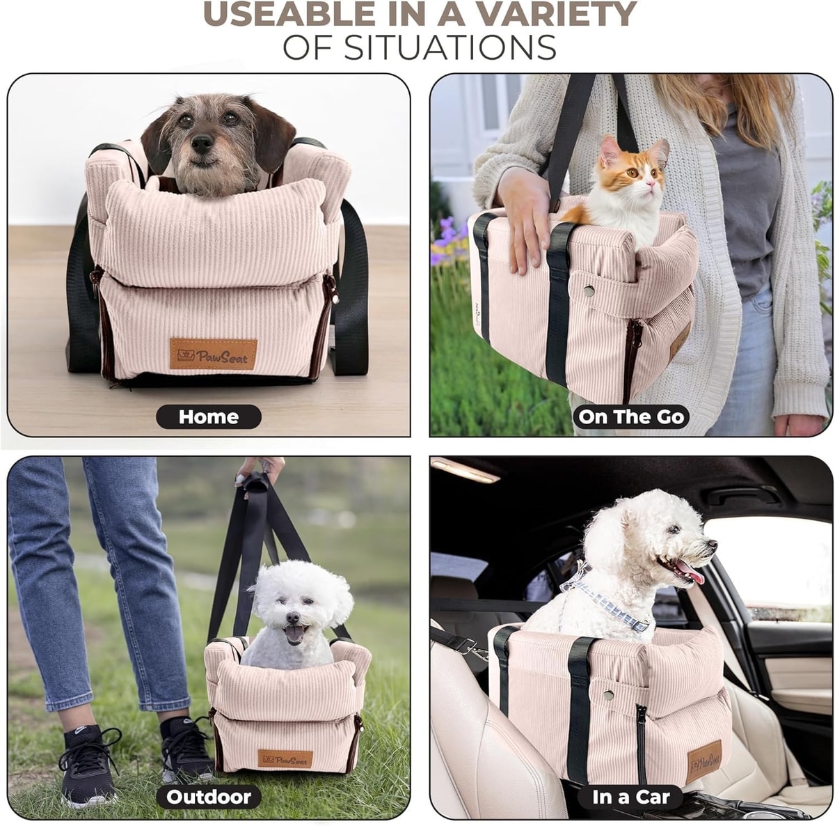 We have designed PawSeat prioritizing safety. With triple heavy-duty elastic velcro straps as well as a stabilizing headrest strap keeping it in place, PawSeat is stably secured. All while the built-in bungee seat belt (security leash) prevents jumping and keeps the pet in place. Please note that for optimal safety, we recommend to always use a harness instead of a collar and clip it to the built-in security leash. We find that covering the seat with a cozy blanket or toy that your little buddy is comfortable with can help them feel more confident!