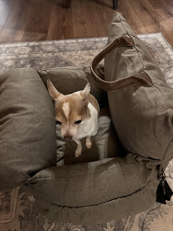 This is a very nice, well made car seat/carrier/bed. Barney could not be more comfortable in it. Really nice material. Lots of padding and very soft. It makes him a nice “nest.” Like that it can be washed if needed. Handles are secure, making it easy to carry with him in it. It is up for grabs once it is moved inside as the cats try to claim it before he can get to it! I put this in the front seat in order to secure the strap around the seat. It did not come with instructions, but in checking the website, was told “install in back seat only.” I could not figure out how to strap it securely in the back seat (the reason for 4 stars instead of 5). The bottom is nonslip material but did not feel it enough to hold seat in place in a collision. I did try to secure the strap around headrest but did not satisfy me. (It could be that I’m just not smart enough to figure it out.)
