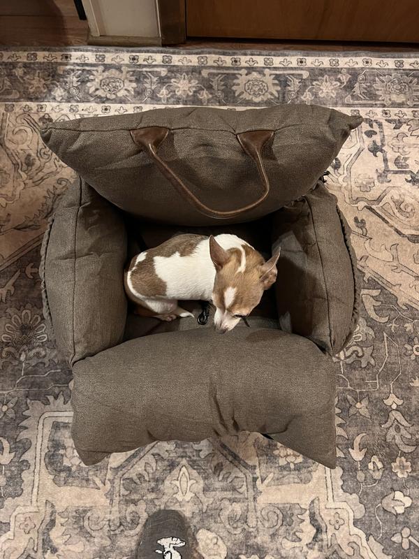 I wanted this to use for my 4 pound Chihuahua who gets motion sickness to help lift him up in the car. I like that it’s square in shape to keep it from moving around. The strap inside to hold your dog in place to me is flimsy and honestly I wouldn’t trust it if there was an accident. I also don’t love the “strap” that you are supposed to put through the seat belt to prevent the dog bed/seat from moving around. It also doesn’t appear very secure. Now it’s very cushy, my dog loves it and he seems very comfortable. I think it would work well if you travel with your pet and need a dual purpose seat/bed but it is bulky to carry and would be heavy with your pet in it. Also I think it’s kinda expensive since really the best use is for a dog bed. I would not pay full price for this. Probably would not use this for a pet over 10 pounds. As stated my dog in the photos is 4 pounds for reference.