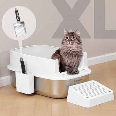PawsPik Stainless Steel Cat Litter Box & Metal Scooper, X-Large, Cream