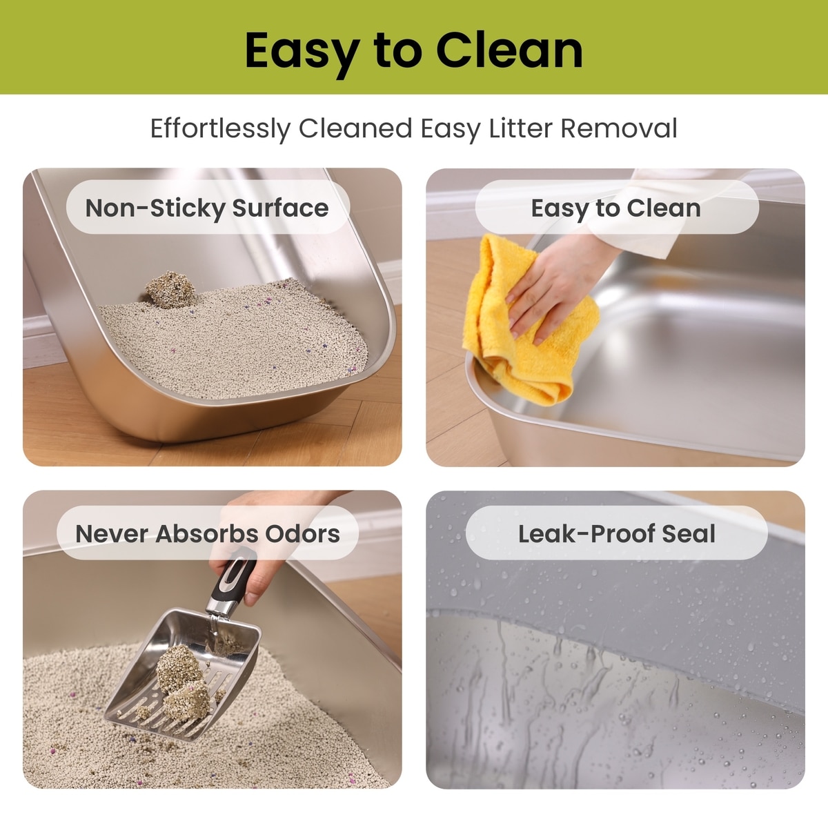 Keep Tidy & Reduce Odor Stainless steel resists odor absorption—unlike plastic. Its non-porous surface also prevents bacteria buildup, keeping your litter box cleaner and fresher for longer.