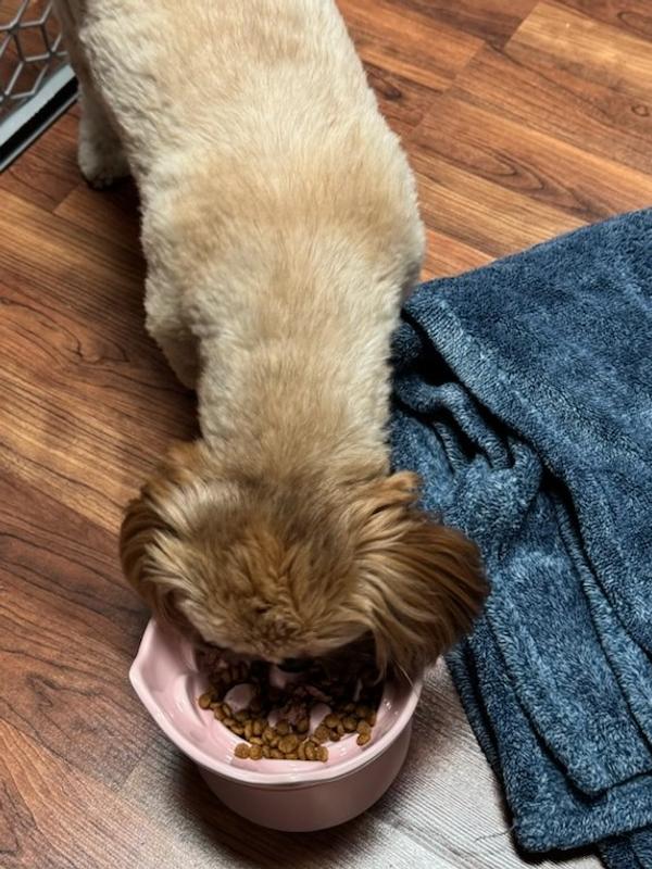 We ordered this slow feeder for our 14 pound Shih Tzu, Spuddy. This ceramic slow feeder is so thoughtfully designed! It is heavy so it does not slide around while Spud eats and the back is raised so Spud's food does not fall out of the bowl while he eats. It is dishwasher safe but I like that if I handwash it, I can set it upside-down to dry and it does not wobble. Spud ate more slowly, but it was also not too difficult for him to eat. This is a great bowl that we will use for years to come!