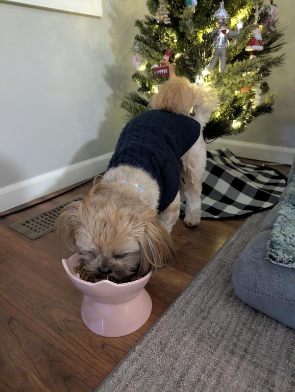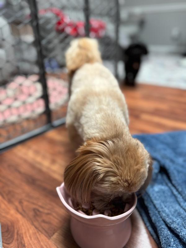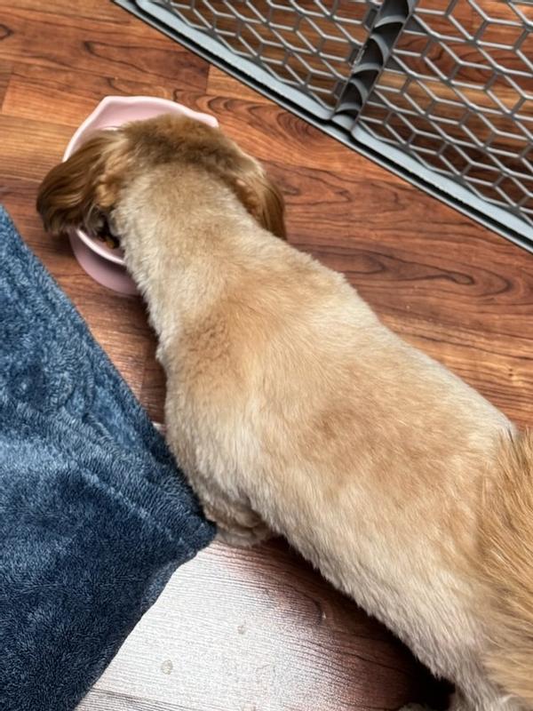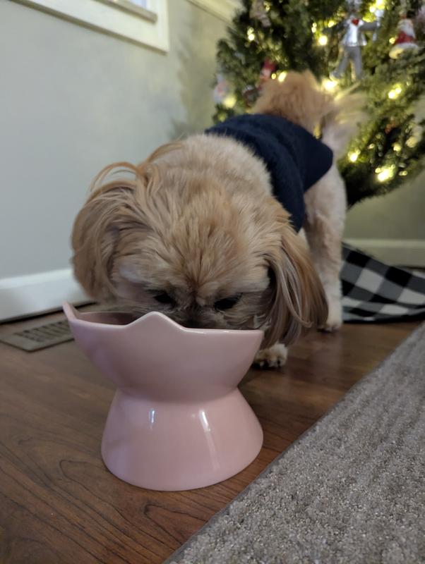 We ordered this slow feeder for our 14 pound Shih Tzu, Spuddy. This ceramic slow feeder is so thoughtfully designed! It is heavy so it does not slide around while