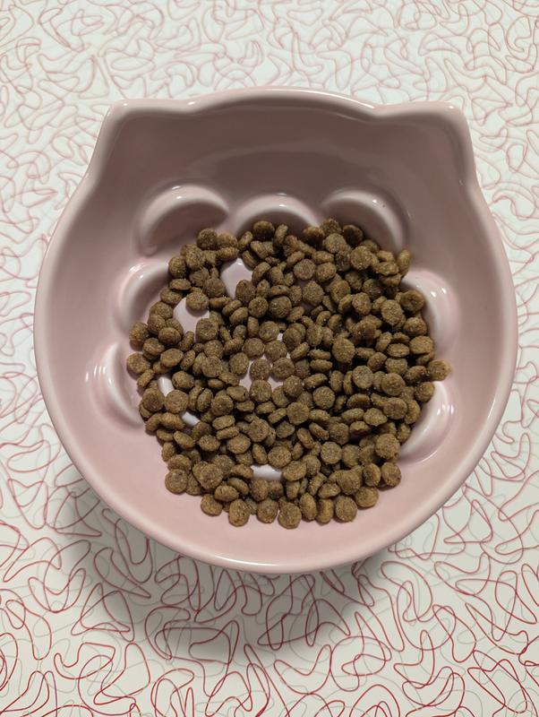 The bowl is larger than expected which makes it nice for really spreading out the wet food to help prevent fast eating. The pink color is pretty and my cat seems