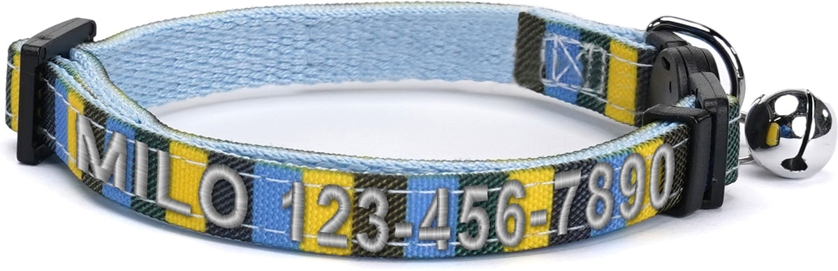Pawtitas Multicolor Personalized Breakaway Cat Collar, Blue/Yellow/Green, X-Small: 8 to 12-in neck, 3/8-in wide