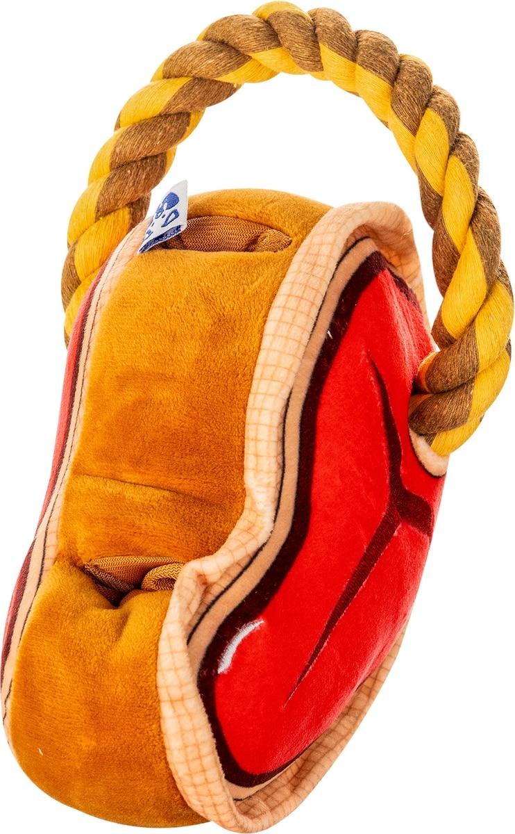 PAWTY TOYS Steak Tug Rope with Treat Slot Squeaky Plush Dog Toy