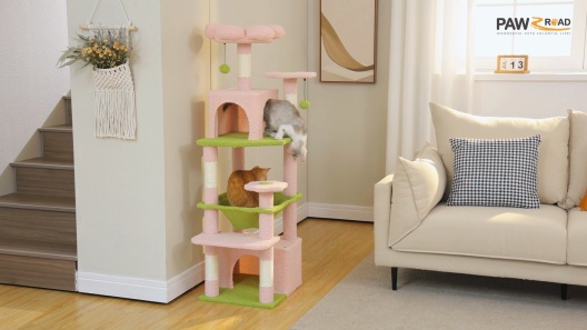 The cat tree includes 5 reinforced posts wrapped with 100% natural sisal, providing multiple scratching surfaces for cats to sharpen their nails and enjoy endless fun, while protecting your furniture from damage.