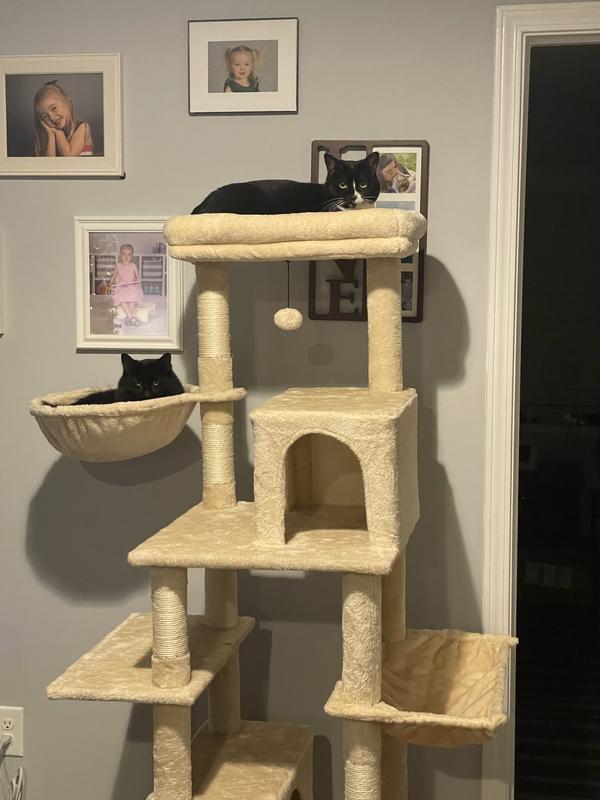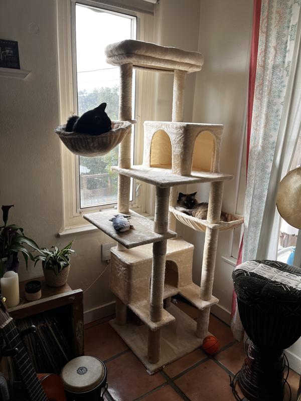 Lots of places for my cats to hang out and play easy to put together price was affordable that fits perfectly in the corner of my living room