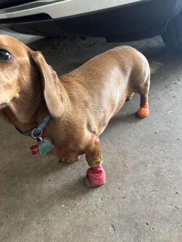 I was so happy to find Pawz products. My poor old dog knuckles which makes his paws bleed. I tried wrapping his feet in vet tape but it wore off before a short walk was over. These balloon shoes keep the vet tape from being destroyed and that keeps my boy from making his feet bleed when he walks.