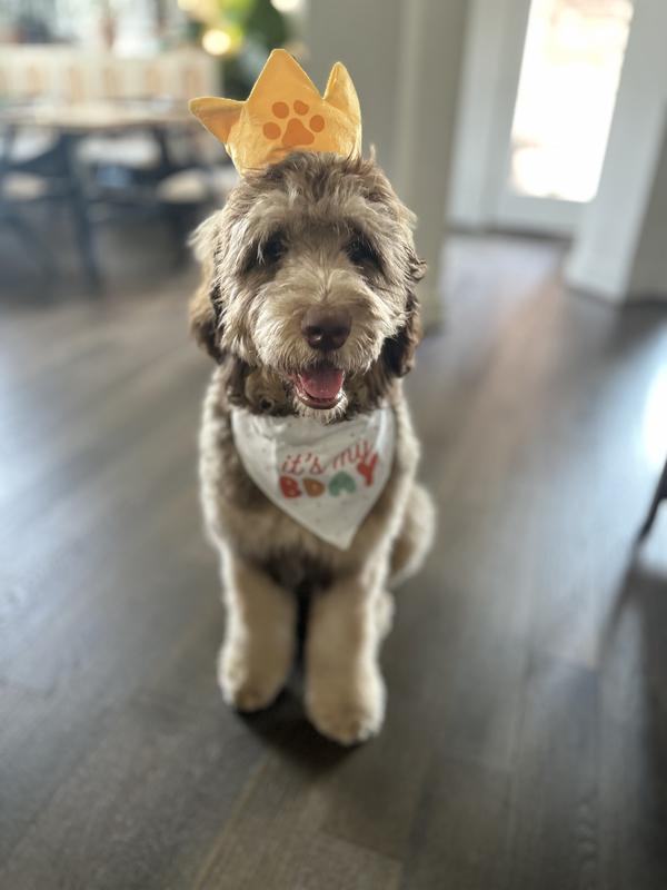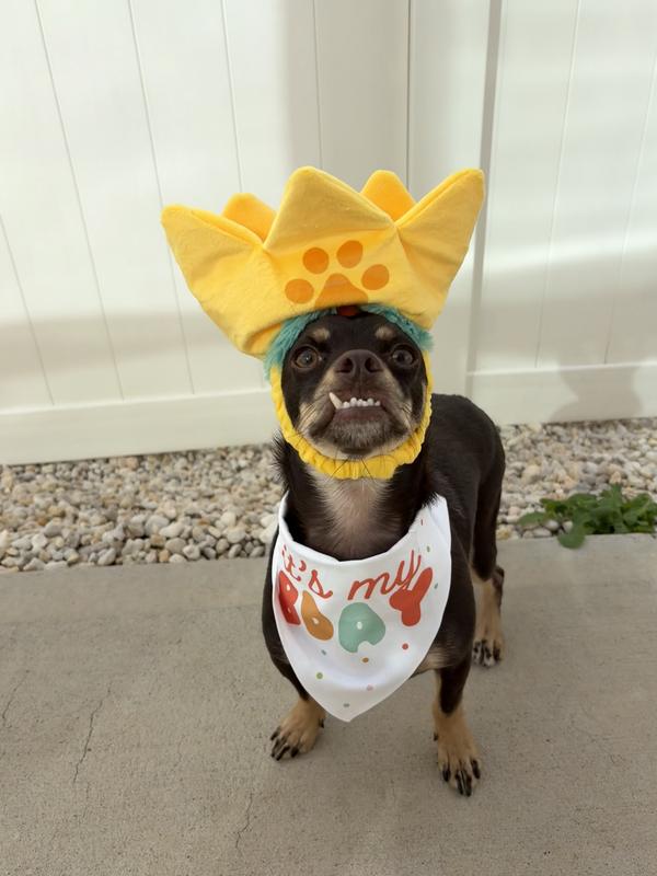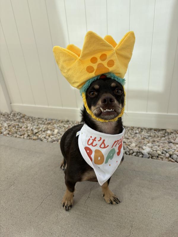 Perfect little birthday set! The crown was a bit snug on our girl, but the bandana was a good one-size fit! She is absolutely *obsessed* with the crown as a toy, though. Ours is missing the squeaker, so I've reduced a star for that, but otherwise this has become her favorite toy.