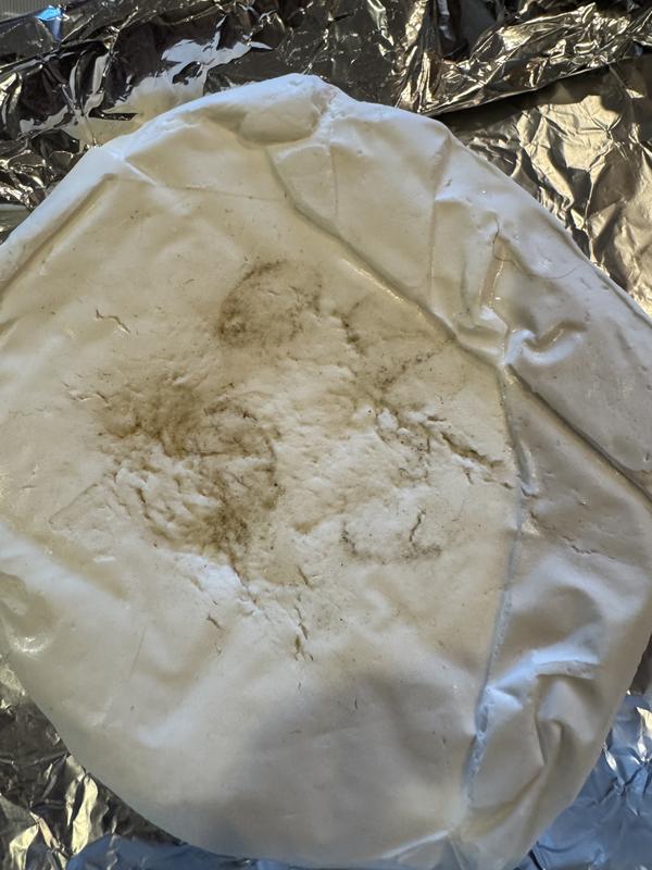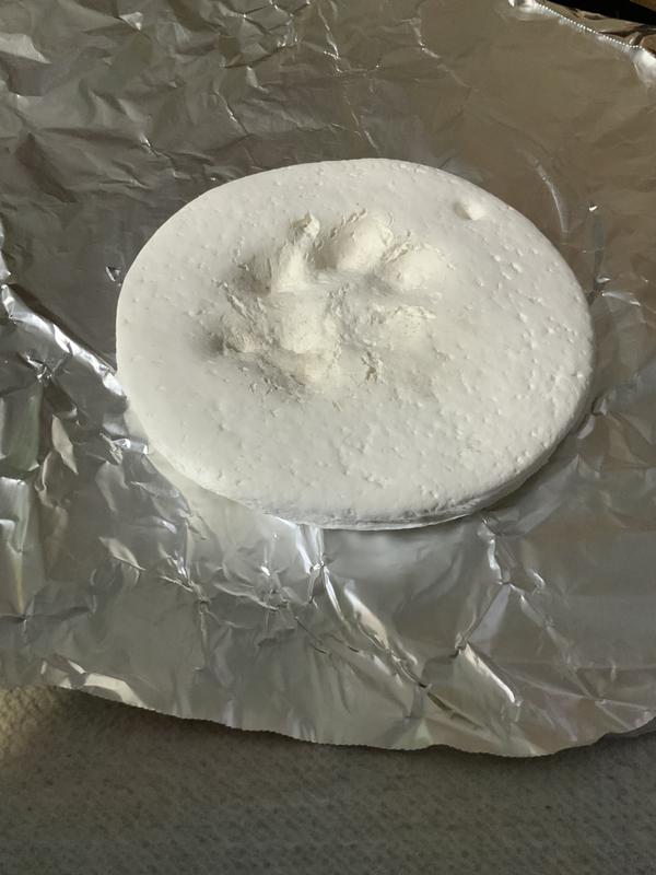 I’ve used several paw print kits like this before, all different brands, and I’ve also worked with air dry clay with my kids on many occasions, but the material included with this kit was very weird and did not work well. The kit was in our house at room temperature for three days before we worked with it . First of all, you were supposed to knead the clay, and I could not get it to move, no matter how hard I pushed on it. Then, when I tried to roll it out, it wouldn’t get any bigger. No matter how hard I pushed. My son and my daughter tried, and they couldn’t get it to move either. In addition, rolling it seemed to cause a kind of pebbling on the surface as ifthe dough was tearing in little places all over. The instructions say to roll it into smooth, but the more we rolled it, the more pebbled it became! I figured I would try to work with it anyway, and I took my most complacent cat, wet his paw, and then pushed it in to the clay. There was literally no impression. I tried again and pushed harder, and there was a very slight indentation from his top toe beans, but nothing from the main pad and it didn’t look anything like a paw print. I returned this item. The photo shows how rippled and pebbled the surface became when we rolled it.