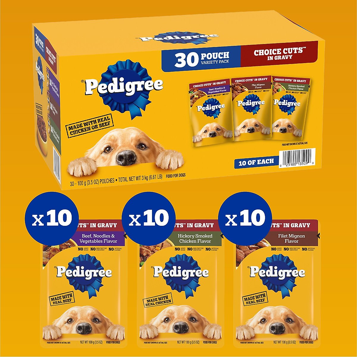 - Pedigree Choice Cuts in Gravy Variety Pack Filet Mignon, Grilled Chicken, Chicken Casserole & Beef Noodle Adult Wet Dog Food Pouches, 3.5-oz, case of 24$20.98 Chewy Price$21.99 List Price$19.93 Autoship PricePromo, New Customers Only: Spend $49+, Get $20 eGift Card