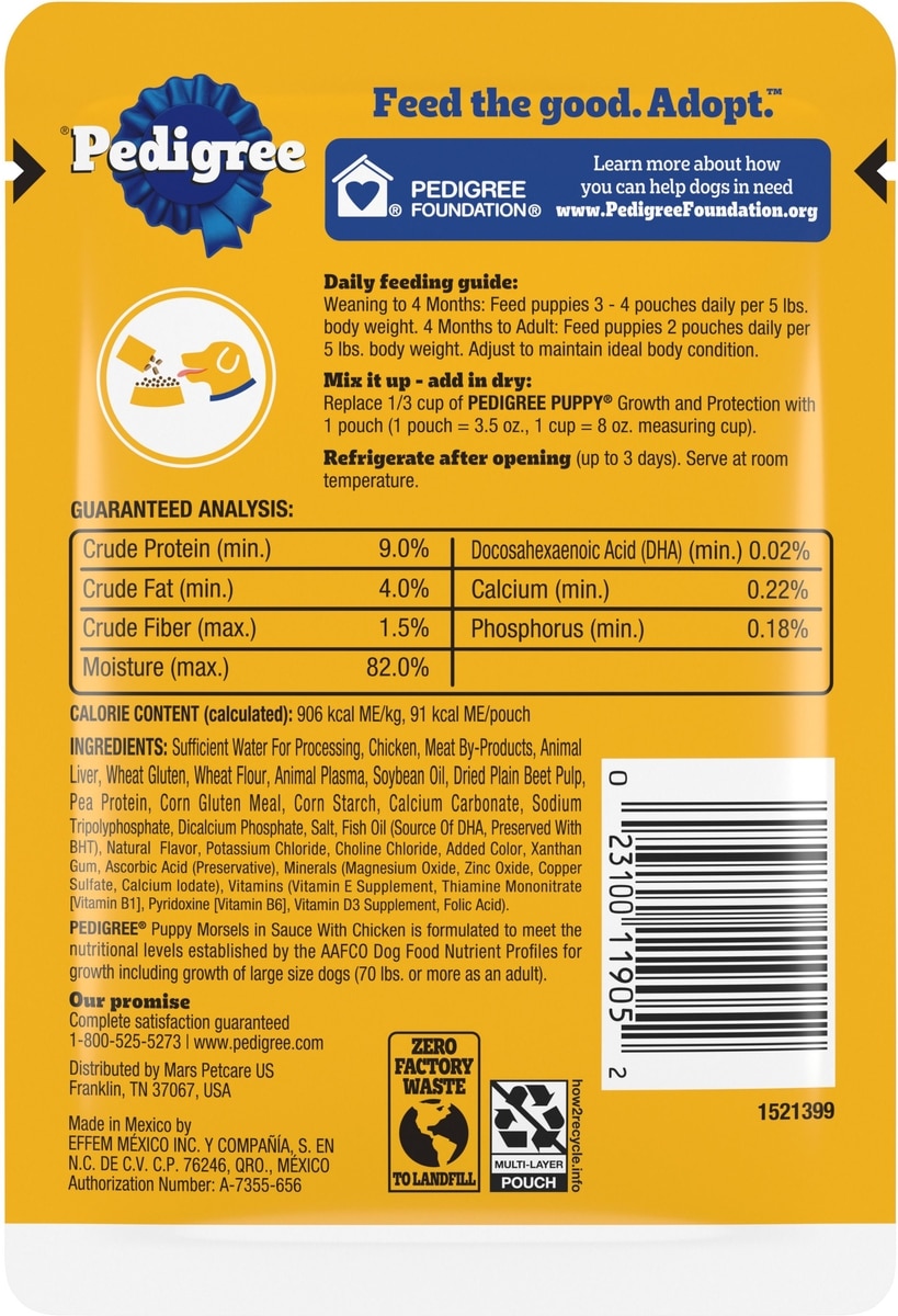 - Pedigree Puppy Morsels in Sauce with Beef Wet Dog Food, 3.5-oz pouch, pack of 16$16.41 Chewy Price$17.44 List Price$15.59 Autoship PricePromo, New Customers Only: Spend $49+, Get $20 eGift Card