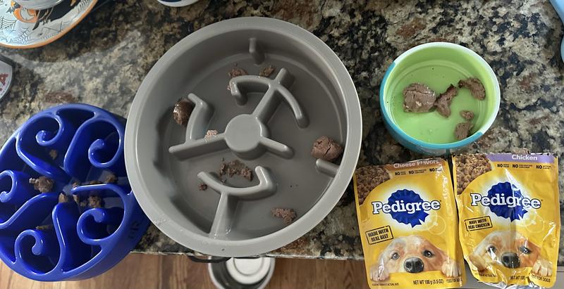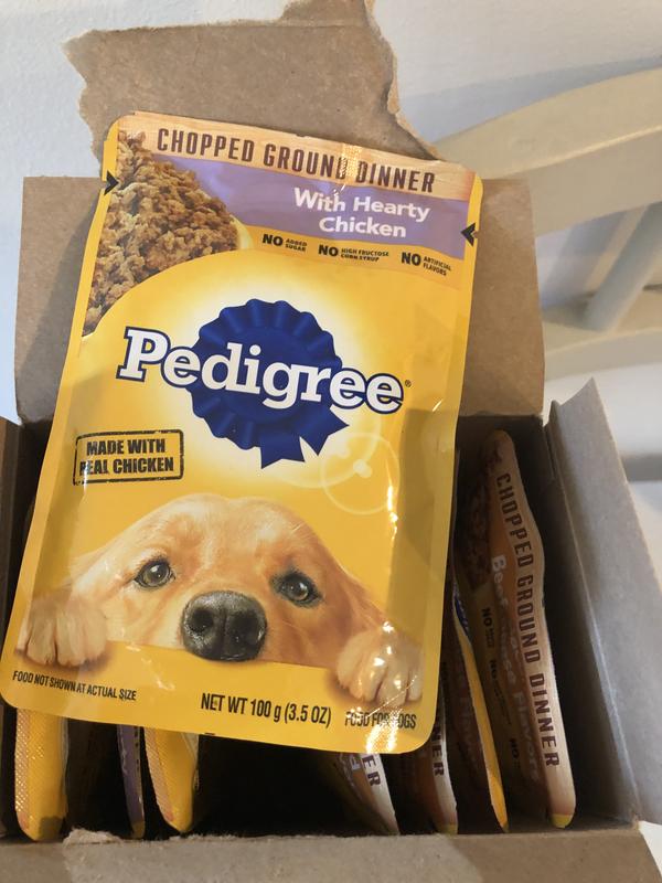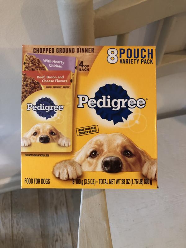 - Pedigree Chopped Ground Dinner Variety Pack with Chicken, Beef & Bacon Wet Dog Food, 3.5-oz pouch, case of 18$15.97 Chewy Price$17.19 List Price$15.17 Autoship PricePromo, New Customers Only: Spend $49+, Get $20 eGift Card