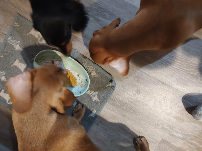 My frenchie absolutely loves these! I split the beef flavor serving across his two meals and he gobbles it up. He even continues going back to lick the bowl to make sure he got it all!
